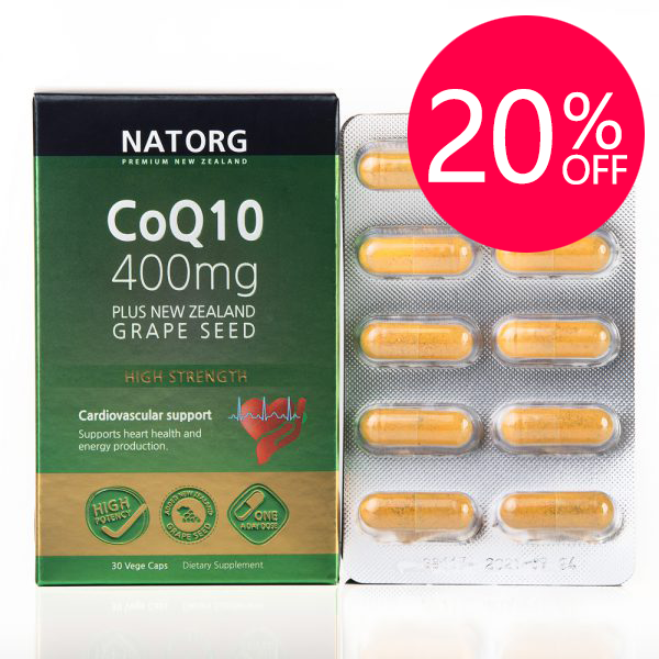 NATORG CoQ 10 + NZ Grape seed supports optimal function of heart muscle and blood vessel walls. It provides powerful antioxidant protection with added NZ grapeseed.